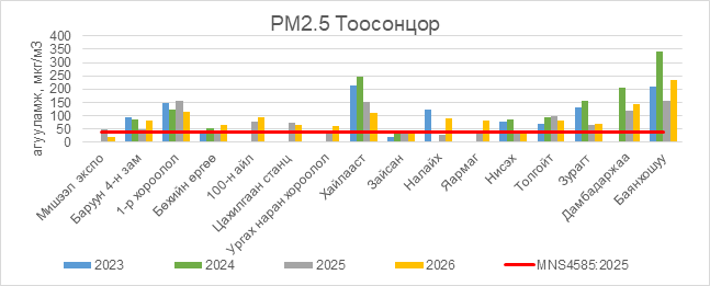 РМ2.5 тоосонцор нь Баруун 4-н зам орчим АЧС-аас 45.5 мкг/м3 –ээр их, 1-р хороолол орчим АЧС-аас 76.5 мкг/м3 –ээр их, Бөхийн өргөө орчим АЧС-аас 29.5 мкг/м3 –ээр их, 100-н айл орчим АЧС-аас 58.5 мкг/м3 –ээр их, Цахилгаан станц орчим АЧС-аас 27.5 мкг/м3 –ээр их, Ургах наран хороолол орчим АЧС-аас 24.5 мкг/м3 –ээр их, Хайлааст орчим АЧС-аас 75.5 мкг/м3 –ээр их, Налайх орчим АЧС-аас 54.5 мкг/м3 –ээр их, Яармаг орчим АЧС-аас 45.5 мкг/м3 –ээр их, Нисэх орчим АЧС-аас 1.5 мкг/м3 –ээр их, Толгойт орчим АЧС-аас 44.5 мкг/м3 –ээр их, Зурагт орчим АЧС-аас 31.5 мкг/м3 –ээр их, Дамбадаржаа орчим АЧС-аас 105.5 мкг/м3 –ээр их, Баянхошуу орчим АЧС-аас 198.5 мкг/м3 –ээр их байна.