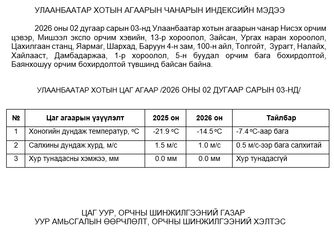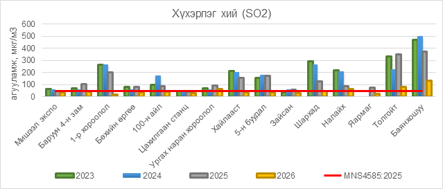 2026 оны 02 дугаар сарын 03-ны байдлаар хүхэрлэг хий (SO2) нь Ургах наран хороолол орчим АЧС-аас 17 мкг/м3 –ээр их, Налайх орчим АЧС-аас 14 мкг/м3 –ээр их, Толгойт орчим АЧС-аас 33 мкг/м3 –ээр их, Баянхошуу орчим АЧС-аас 82 мкг/м3 –ээр их, бусад цэгүүдэд MNS 4585:2025 АЧС-аас даваагүй байна.