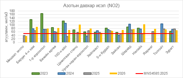 Азотын давхар исэл (NO2) нь Баруун 4-н зам орчим АЧС-аас 39 мкг/м3 –ээр их, 1-р хороолол орчим 29 мкг/м3 –ээр их, Бөхийн өргөө орчим АЧС-аас 32 мкг/м3 –ээр их, 100-н айл орчим АЧС-аас 20 мкг/м3 –ээр их, Цахилгаан станц орчим АЧС-аас 51 мкг/м3 –ээр их, Ургах наран хороолол орчим АЧС-аас 28 мкг/м3 –ээр их, Хайлааст орчим АЧС-аас 4 мкг/м3 –ээр их, 5-н буудал орчим АЧС-аас 16 мкг/м3 –ээр их, Зайсан орчим АЧС-аас 20 мкг/м3 –ээр их, Шархад орчим АЧС-аас 26 мкг/м3 –ээр их, Налайх орчим АЧС-аас 54 мкг/м3 –ээр их, Яармаг орчим АЧС-аас 27 мкг/м3 –ээр их, Толгойт орчим АЧС-аас 24 мкг/м3 –ээр их, Зурагт орчим АЧС-аас 19 мкг/м3 –ээр их байна.