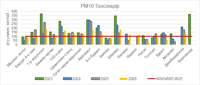 РМ10 тоосонцор нь 1-р хороолол орчим АЧС-аас 87 мкг/м3 –ээр их, 100-н айл орчим АЧС-аас 69 мкг/м3 –ээр их, Цахилгаан станц орчим АЧС-аас 29 мкг/м3 –ээр их, Ургах наран хороолол орчим АЧС-аас 29 мкг/м3 –ээр их, Хайлааст орчим АЧС-аас 78 мкг/м3 –ээр их, 5-н буудал орчим АЧС-аас 21 мкг/м3 –ээр их, Шархад орчим АЧС-аас 79 мкг/м3 –ээр их, Налайх орчим АЧС-аас 21 мкг/м3 –ээр их, Яармаг орчим АЧС-аас 19 мкг/м3 –ээр их, Дамбадаржаа орчим АЧС-аас 33 мкг/м3 –ээр их байна.