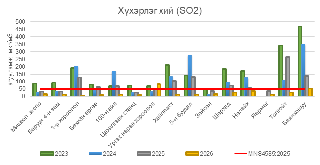 2026 оны 02 дугаар сарын 04-ний байдлаар хүхэрлэг хий (SO2) нь Ургах наран хороолол орчим АЧС-аас 32 мкг/м3 –ээр их, Баянхошуу орчим АЧС-аас 4 мкг/м3 –ээр их, бусад цэгүүдэд MNS 4585:2025 АЧС-аас даваагүй байна.