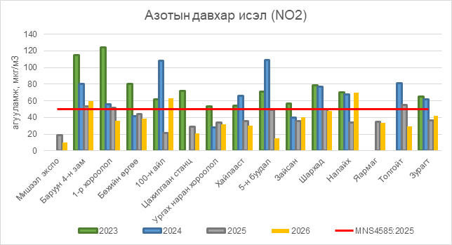 Азотын давхар исэл (NO2) нь Баруун 4-н зам орчим АЧС-аас 10 мкг/м3 –ээр их, 100-н айл орчим АЧС-аас 13 мкг/м3 –ээр их, Налайх орчим АЧС-аас 20 мкг/м3 –ээр их, бусад цэгүүдэд MNS 4585:2025 АЧС-аас даваагүй байна.