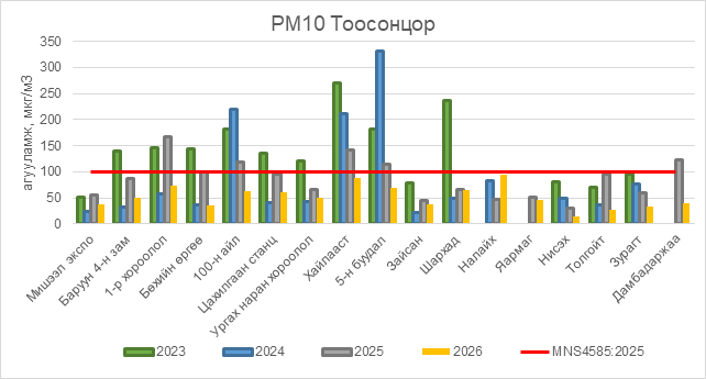 РМ10 тоосонцор нь бүх цэгүүдэд MNS 4585:2025 АЧС-аас даваагүй байна.