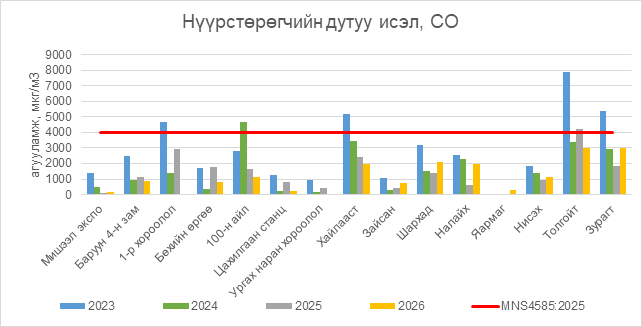 Нүүрстөрөгчийн дутуу исэл (СО) нь бүх цэгүүдэд MNS 4585:2025 АЧС-аас даваагүй байна.