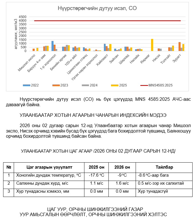 УЛААНБААТАР ХОТЫН АГААРЫН ЧАНАРЫН ХЯНАЛТ ШИНЖИЛГЭЭНИЙ ХОНОГИЙН МЭДЭЭ /2026.03.02/