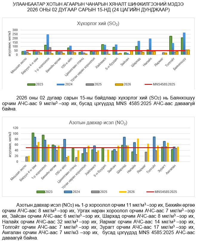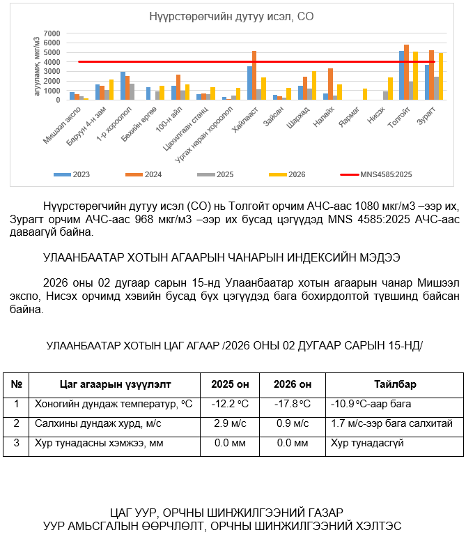 УЛААНБААТАР ХОТЫН АГААРЫН ЧАНАРЫН ХЯНАЛТ ШИНЖИЛГЭЭНИЙ ХОНОГИЙН МЭДЭЭ /2026.03.02/