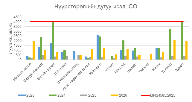 Нүүрстөрөгчийн дутуу исэл (СО) нь бүх цэгүүдэд MNS 4585:2025 АЧС-аас даваагүй байна.