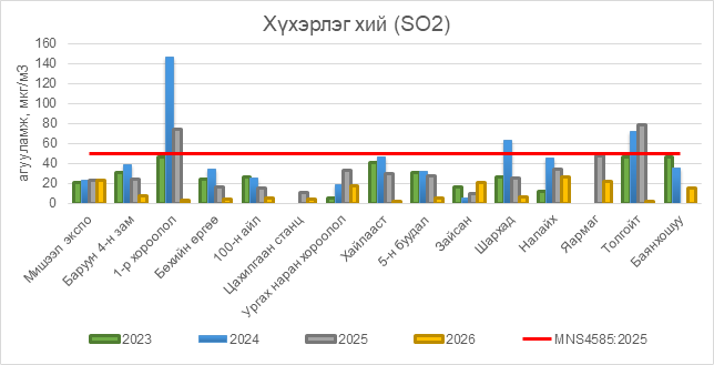 2026 оны 03 дугаар сарын 31-ний байдлаар хүхэрлэг хий (SO2) нь бүх цэгүүдэд MNS 4585:2025 АЧС-аас даваагүй байна.
