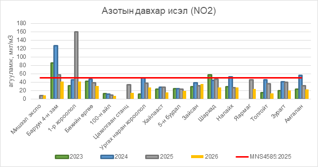 Азотын давхар исэл (NO2) нь бүх цэгүүдэд MNS 4585:2025 АЧС-аас даваагүй байна.