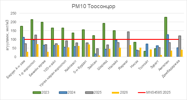 РМ10 тоосонцор нь бүх цэгүүдэд MNS 4585:2025 АЧС-аас даваагүй байна.