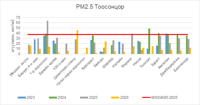 РМ2.5 тоосонцор нь Цахилгаан станц орчим АЧС-аас 8.5 мкг/м3 –ээр их, бусад цэгүүдэд MNS 4585:2025 АЧС-аас даваагүй байна.