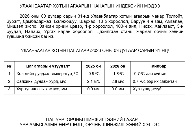УЛААНБААТАР ХОТЫН АГААРЫН ЧАНАРЫН ХЯНАЛТ ШИНЖИЛГЭЭНИЙ ХОНОГИЙН МЭДЭЭ /2026.03.31/
