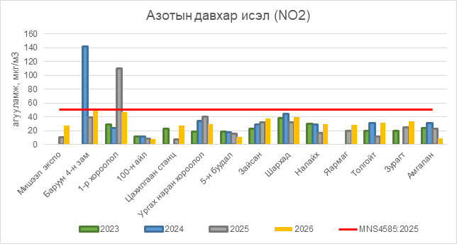 Азотын давхар исэл (NO2) нь Баруун 4-н зам орчим АЧС-аас 1 мкг/м3 –ээр их, бусад цэгүүдэд MNS 4585:2025 АЧС-аас даваагүй байна.