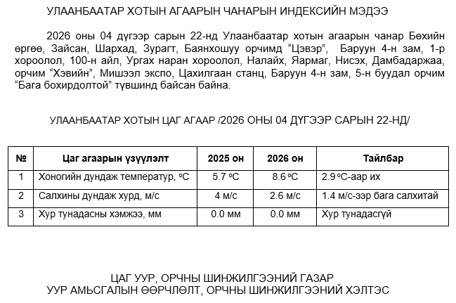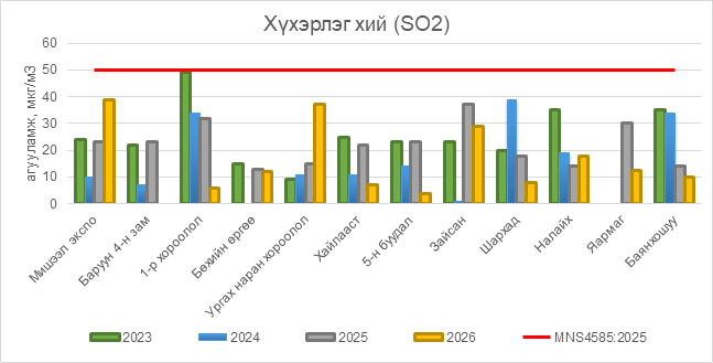2026 оны 04 дүгээр сарын 22-ний байдлаар хүхэрлэг хий (SO2) нь бүх цэгүүдэд MNS 4585:2025 АЧС-аас даваагүй байна.