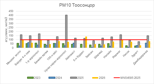 РМ10 тоосонцор нь Мишээл экспо орчим АЧС-аас 3 мкг/м3 –ээр их, 5-н буудал орчим АЧС-аас 39 мкг/м3 –ээр их, бусад цэгүүдэд MNS 4585:2025 АЧС-аас даваагүй байна.