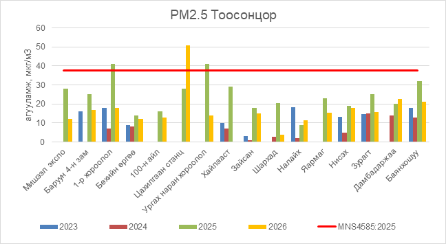 РМ2.5 тоосонцор 5 буудал орчим АЧС-аас 39 мкг/м3 –ээр их, бусад цэгүүдэд MNS 4585:2025 АЧС-аас даваагүй байна.