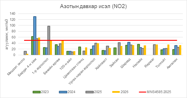 Азотын давхар исэл (NO2) Баруун 4-н зам орчим АЧС-аас 9 мкг/м3 –ээр их, 1-р хороолол орчим 1 мкг/м3 –ээр их, бусад цэгт MNS 4585:2025 АЧС-аас даваагүй байна.
