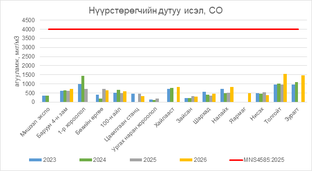 Нүүрстөрөгчийн дутуу исэл (СО) бүх цэгт MNS 4585:2025 АЧС-аас даваагүй байна.