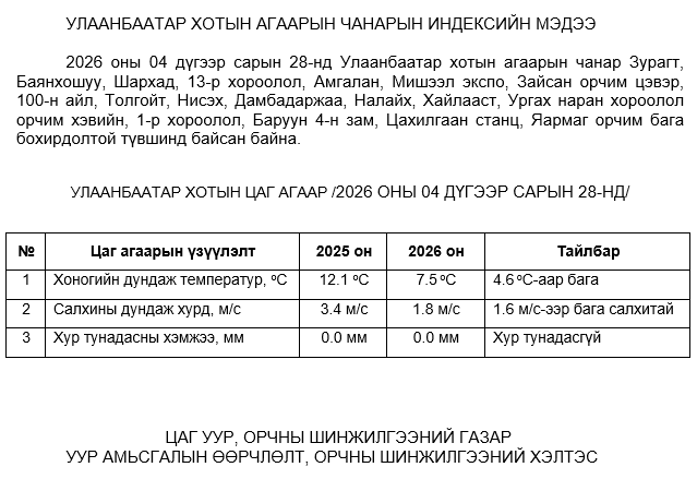 2026 оны 04 дүгээр сарын 28-ны байдлаар хүхэрлэг хий (SO2) бүх цэгт MNS 4585:2025 АЧС-аас даваагүй байна.