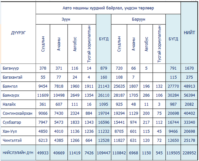 Мэдээллийн эх сурвалж: Тээврийн хэрэгслэлийн оношлогоо, хяналт, зохицуулалтын алба 2013.01.05
