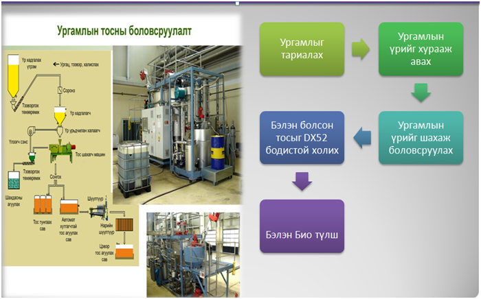 - —Биотүлш нь 100% хүйтэн шахалттай цэвэрлэгдсэн ургамалын тос, тэсрэх чанарыг сайжруулахад нэмж 2-4 % “additiv” хийдэг.