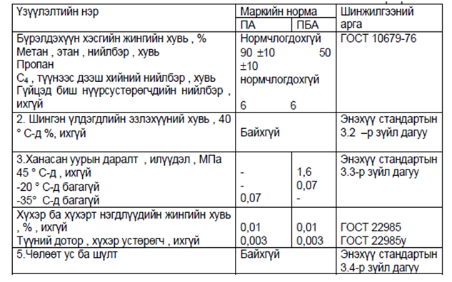 2.3.1. Шингэрүүлсэн шатдаг хий физик-химийн үзүүлэлтүүдээрээ 2-р хүснэгтэнд нэгтэгсэн шаардлагыг хангана.