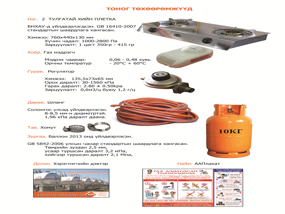 Иж бүрдэлд хийн плитка, баллонтой хий, аюулгүйн хамгаалалтын хэрэгслүүд багтах ажээ.