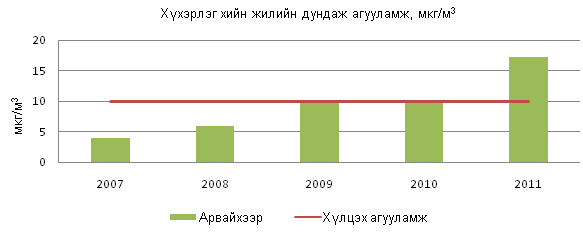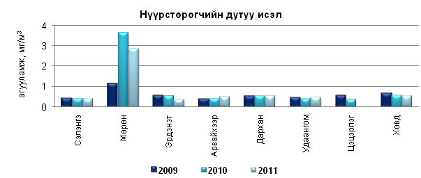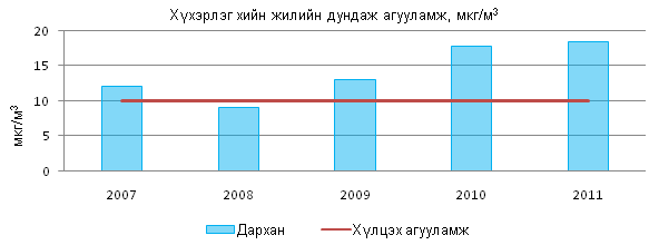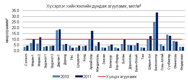 2011 онд Баянхонгор, Дархан, Арвайхээр хотын жилийн дундаж агууламж стандарт хэмжээнээс нилээд давсан бохирдолтой байсан бол Мөрөн,