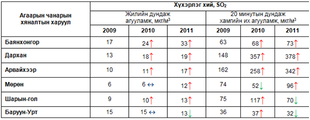 Орон нутгийн харуулуудын 2011 оны шинжилгээний дүнгээс үзэхэд хүхэрлэг хийн жилийн дундаж агууламж агаарын чанарын стандарт (жилийн дундаж агууламж, 10мкг/м3)-аас Баянхонгор 3.3 дахин, Дархан 1.9 дахин, Арвайхээр 1.7, Баруун-Урт, Шарын гол 1.3 дахин, Мөрөн 1.2 дахин давсан байна.
