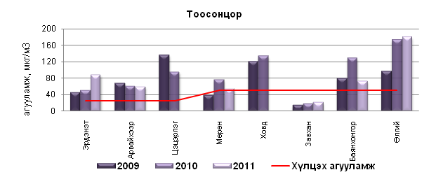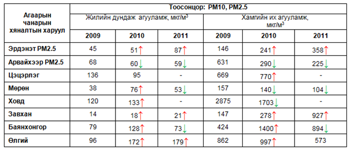2011 онд том ширхэглэгт тоосонцор (PM10)-ын жилийн дундаж агууламж АЧС (жилийн дундаж агууламж, 50мкг/м3)-аас Баянхонгор 1.5 дахин, Мөрөн 1.1 дахин, Өлгий 3.6 дахин давсан бохирдол илэрсэн бол Улиастай харуулд стандартын хэмжээнд байсан байна. Өмнөх оноос тоосонцорын бохирдол Завхан 16.7%, Ховд 10.8%, Өлгий 4.1%-иар ихэсч Баянхонгор 42.9%, Мөрөн 30.2%-иар буурсан байна. Нарийн ширхэглэгт тоосонцор (PM2.5)-ын жилийн дундаж агууламж АЧС (жилийн дундаж, 25мкг/м3)-аас Эрдэнэт хотод 3.5 дахин (өмнөх оноос 70.5%-иар өссөн) Арвайхээр хотод 2.4 дахин (өмнөх оноос 1.7%-иар буурсан) их байна.