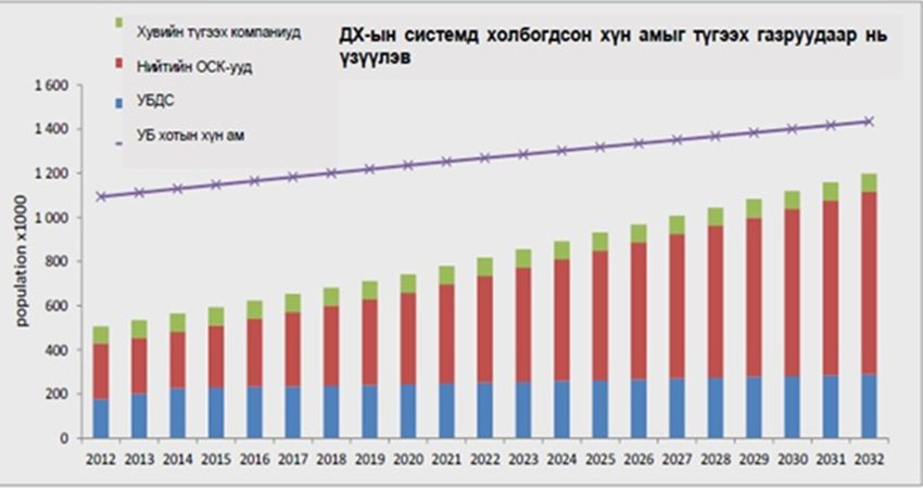 Хот болон УБДС-ний дундах мэдээлэл зөрчилтэй байдаг хэдий ч, 500,000 оршин суугчдыг Дулааны Сүлжээнд холбогдсон гэж тооцож болно. Дээрх тоог доорх үзүүлэлтүүдийг тооцон үзэж гаргасан: