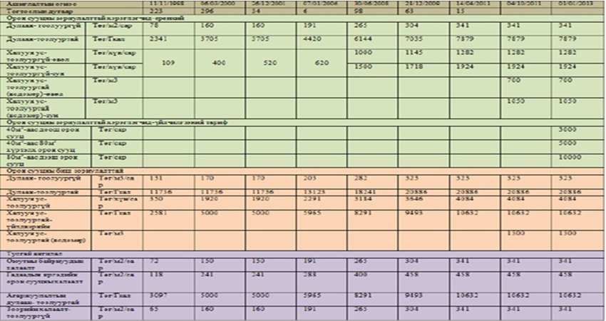 Орон сууцны хэрэглэгчдийн ихэнхи нь дулааны тоолуургүй тарифаар буюу халаалтыг орон сууцны талбайн хэмжээгээр, халуун усыг байран дахь хүний тоогоор тооцсоноор төлбөр тооцоогоо төлдөг. Түүнчлэн, 2012 онд нэвтрүүлсэн орон сууцны талбайн хэмжээн дээр суурилсан үйлчилгээний хураамжийг төлдөг байна. Орон сууцны бус хэрэглэгчдийн ихэнхи нь тоолууртай тарифаар төлбөрөө төлдөг. Дулааны тоолуургүй тарифыг зөвхөн халаалтын улиралд ашигладаг. Жилийн туршид төлдөг үйлчилгээний тарифаас ялгаатай юм. Тарифын хүснэгтэд дулаанд хөндлөнгийн татаасын түвшин их байгааг харуулж байна.