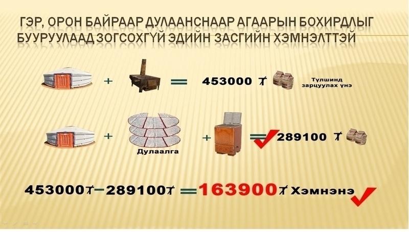 Агаарын бохирдлын 75 хувийг бий болгодог гэх гэр хорооллын утааг багасгахын тулд сайжруулсан зуух, гэрийн дулаалгыг хямдарсан үнээр иргэдэд олгосон. Тэгвэл нэг айл 453.000 төгрөгийг түлшинд хэрэглэдэг бол сайжруулсан зуух, гэрийн дулаалгыг ашигланаар 163,900 төгрөгийн хэмнэлт хийнэ гэсэн тооцоог гаргажээ.