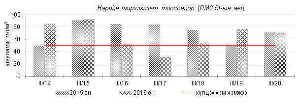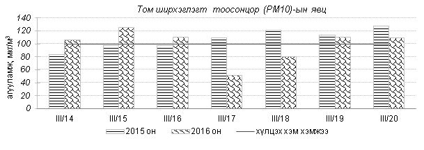 Өнгөрсөн 7 хоногийн агаарын чанарын хяналт шинжилгээний дүнгээр Улаанбаатар хотын гэр хороолол болон төв автозамтай ойр цэгүүдэд агаар “Дунд зэргийн” болон “Их” бохирдолтой байна. Бусад хэсэгт агаар “Бага” зэргийн бохирдолтой болон “Хэвийн” түвшинд байлаа. Дэлгэрэнгүйг хавсралтаас үзэх