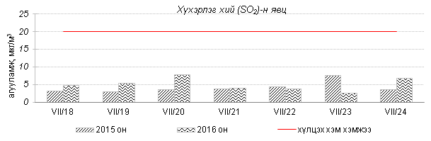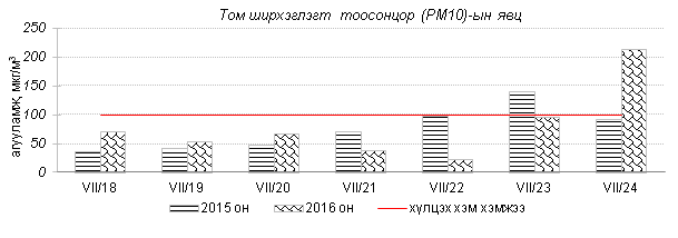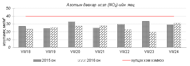 Өнгөрсөн 7 хоногийн агаарын чанарын хяналт шинжилгээний дүнгээр Улаанбаатар хотын төв автозамтай ойролцоо газруудад агаарт азотын давхар исэлийн бохирдол “Бага” зэргийн бохирдолтой түвшинд байсан ба долоо хоногийн сүүлээр тоосонцорын бохирдол “Дунд” зэргийн бохирдолтой түвшинд байна. Дэлэгрэнгүй мэдээллийг хавсралтаас үзнэ үү.