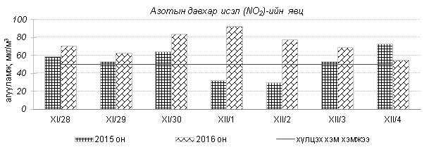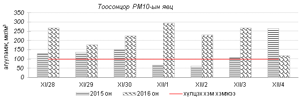 Улаанбаатар хотын агаарт түгээмэл бохирдуулах бодис хүхэрлэг хий /SO2/, азотын давхар исэл /NO2/, тоосонцор /PM10, PM2.5/, нүүрстөрөгчийн дутуу исэл /CO/, озон /O3/-ы агууламжийг тодорхойллоо.