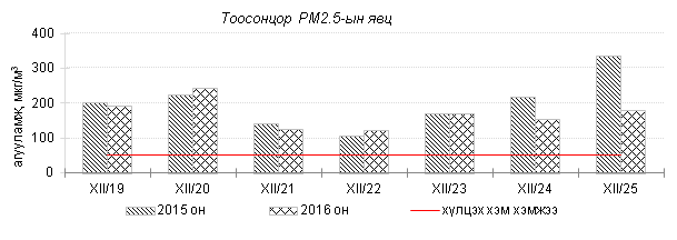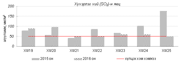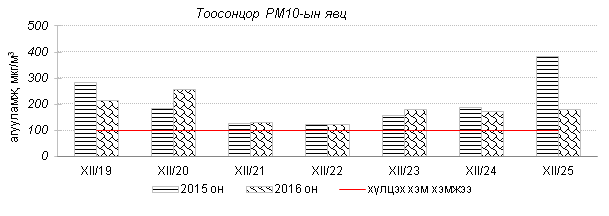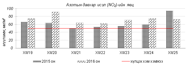 Улаанбаатар хотын агаарт түгээмэл бохирдуулах бодис хүхэрлэг хий /SO2/, азотын давхар исэл /NO2/, тоосонцор /PM10, PM2.5/, нүүрстөрөгчийн дутуу исэл /CO/, озон /O3/-ы агууламжийг тодорхойллоо.