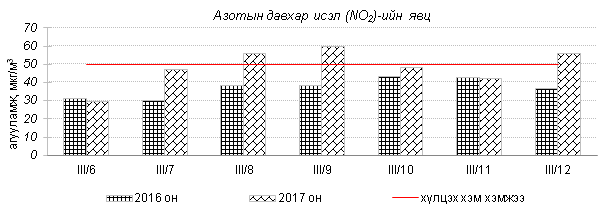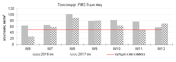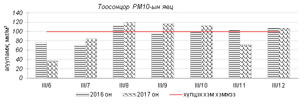 Улаанбаатар хотын агаарт түгээмэл бохирдуулах бодис хүхэрлэг хий /SO2/, азотын давхар исэл /NO2/, тоосонцор /PM10, PM2.5/, нүүрстөрөгчийн дутуу исэл /CO/, озон /O3/-ы агууламжийг тодорхойллоо.