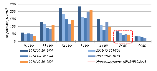 Агаарын чанарын суурин харуулуудын дүнгээр хүхэрлэг хийн 2017 оны 3-р сарын дундаж агууламж 20мкг/м3 хүрсэн бөгөөд өмнөх оны  мөн үеэс 22%-аар бага байлаа (Зураг 4).