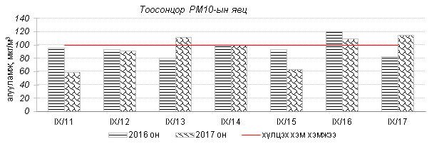 Өнгөрсөн 7 хоногийн агаарын чанарын хяналт шинжилгээний дүнгээр Улаанбаатар хотын хэмжээнд агаар “Хэвийн” болон “Бага” зэргийн бохирдолтой байсан ба гэр хорооллын зарим хэсэгт “Дунд” зэргийн бохирдол илэрч байна. Агаар дахь гол бохирдуулах бодис нь азотын давхар исэл (NO2), PM10 тоосонцор байна. Дэлгэрэнгүй мэдээг хавсралтаас үзнэ үү.