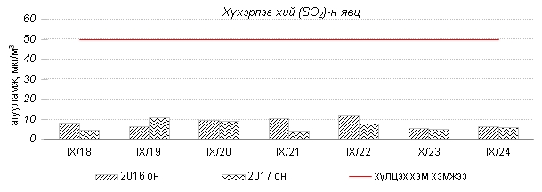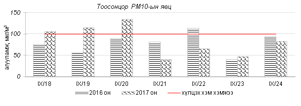 Улаанбаатар хотын агаарт түгээмэл бохирдуулах бодис хүхэрлэг хий /SO2/, азотын давхар исэл /NO2/, тоосонцор /PM10, PM2.5/, нүүрстөрөгчийн дутуу исэл /CO/, озон /O3/-ны агууламжийг тодорхойллоо.