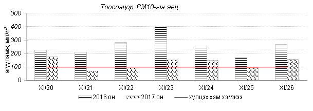 Өнгөрсөн 7 хоногийн агаарын чанарын хяналт шинжилгээний дүнгээр Улаанбаатар хотын хэмжээнд гэр хороолол орчим агаар “Дунд” зэргийн болон “Их” бохирдолтой түвшинд хүрсэн бол автозам, орон сууцны хороолол орчим агаар “Бага” зэргийн бохирдолтой байна. Агаар дахь гол бохирдуулах бодис нь PM2.5, PM10 тоосонцор, азотын давхар исэл (NO2) байна. Дэлгэрэнгүй мэдээг хавсралтаас үзнэ үү