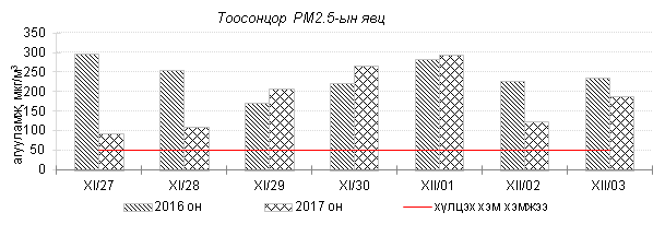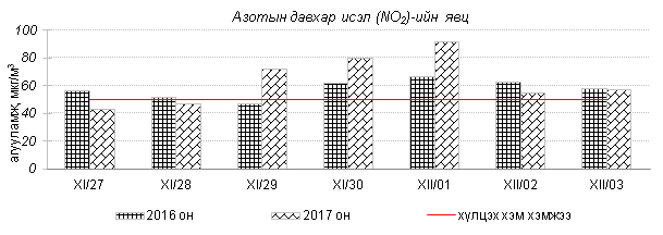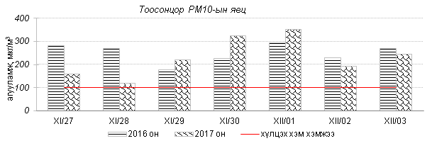 Өнгөрсөн 7 хоногийн агаарын чанарын хяналт шинжилгээний дүнгээр Улаанбаатар хотын хэмжээнд гэр хороолол орчим агаар “Дунд” зэргийн болон “Маш Их” бохирдолтой түвшинд хүрсэн бол автозам, орон сууцны хороолол орчим агаар “Дунд” зэргийн бохирдолтой байна. Агаар дахь гол бохирдуулах бодис нь PM2.5, PM10 тоосонцор, азотын давхар исэл (NO2) байна. Дэлгэрэнгүй мэдээг хавсралтаас үзнэ үү.