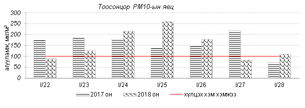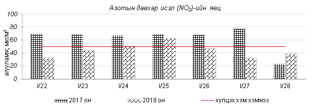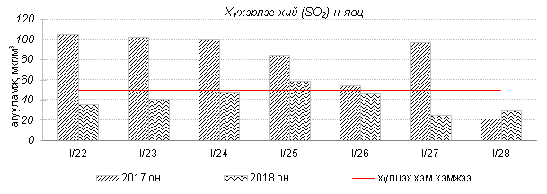 Өнгөрсөн 7 хоногт Улаанбаатар хотын агаарын чанар гэр хороолол орчим “Дунд” болон “Маш их” бохирдолтой бусад бүсүүдэд “Бага” зэргийн бохирдолтой байна. Агаар дахь хүхэрлэг хий SO2, PM2.5 болон PM10 тоосонцрын агууламжийг 2017 оны мөн үетэй харьцуулахад 5-48%-иар бага байна. Агаар бохирдуулах бодисуудын 24 цагийн дундаж агууламжийн хамгийн их нь Агаарын чанарын стандартаас 3.3-6.8 дахин их байна. элгэрэнгүй мэдээг хавсралтаас үзнэ үү.