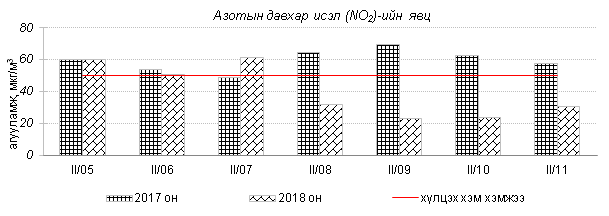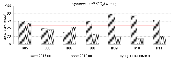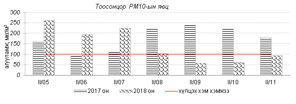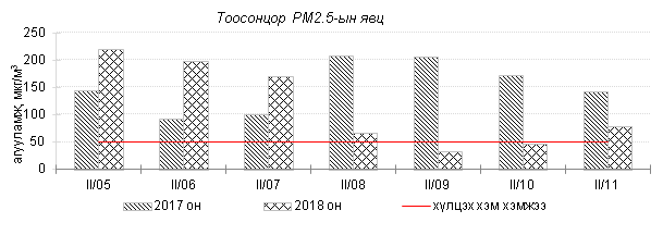 Өнгөрсөн 7 хоногийн агаарын чанарын хяналт шинжилгээний дүнгээр Улаанбаатар хотын агаарын чанар 7 хоногийн эхээр “Дунд” болон “Их” бохирдолтой түвшинд хүрч 2017 оны мөн үетэй харьцуулахад агаар дахь PM2.5, PM10 тоосонцрын агууламж 22-36%-иар, хүхэрлэг хийн агууламж 45%-иар бага байна. PM2.5, PM10 тоосонцор, хүхэрлэг хийн 24 цагийн дундаж хамгийн их агууламж нь Агаарын чанарын стандартаас 2.8-6 дахин их байна. Дэлгэрэнгүй мэдээг хавсралтаас үзнэ үү.