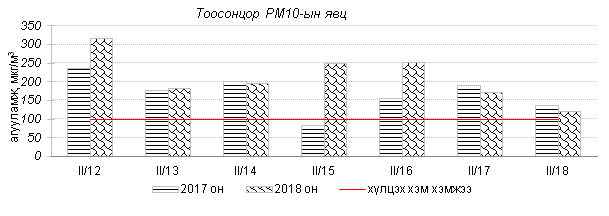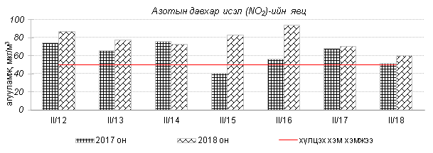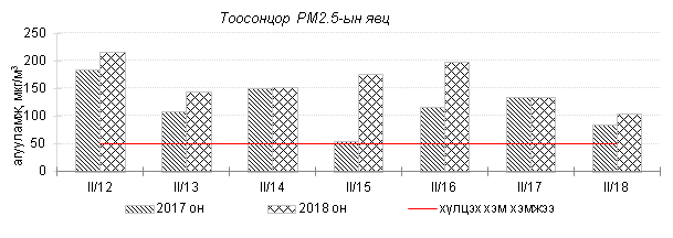 Өнгөрсөн 7 хоногийн агаарын чанарын хяналт шинжилгээний дүнгээр Улаанбаатар хотын агаарын чанар “Дунд” болон “Их” бохирдолтой түвшинд хүрч 2017 оны мөн үетэй харьцуулахад агаар дахь PM2.5, PM10 тоосонцор, хүхэрлэг хийн агууламж 25-33%-иар их байна. PM2.5, PM10 тоосонцор, хүхэрлэг хий, азотын давхар ислийн 24 цагийн дундаж хамгийн их агууламж агаарын чанарын стандартаас 4-6 дахин их байна. Дэлгэрэнгүй мэдээг хавсралтаас үзнэ үү.