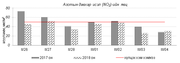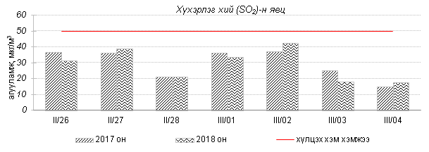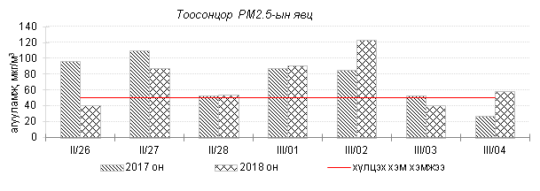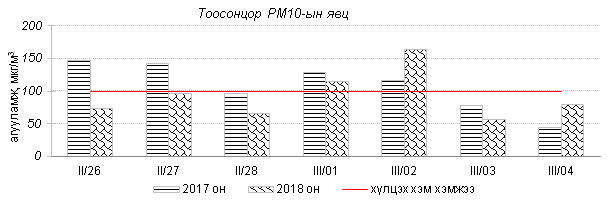 Өнгөрсөн 7 хоногийн агаарын чанарын хяналт шинжилгээний дүнгээр Улаанбаатар хотын агаарын чанар “Бага” болон “Дунд” зэргийн бохирдолтой байсан ба 2017 оны мөн үетэй харьцуулахад агаар дахь PM10 тоосонцрын агууламж 11%-иар бага байна. PM2.5, PM10 тоосонцор, хүхэрлэг хийн 24 цагийн дундаж хамгийн их агууламж нь агаарын чанарын стандартаас 2-4 дахин их байна. Дэлгэрэнгүй мэдээг хавсралтаас үзнэ үү.