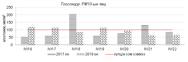 Өнгөрсөн 7 хоногийн агаарын чанарын хяналт шинжилгээний дүнгээр Улаанбаатар хотын хэмжээнд агаарын чанар ихэнх өдрүүдэд “Хэвийн” болон “Бага” зэргийн бохирдолтой байсан байна. Агаар дахь PM2.5, PM10 тоосонцрын 7 хоногийн дундаж агууламж 2017 оны мөн үетэй харьцуулахад 4-13%-иар бага байсан бол 24 цагийн дундаж хамгийн их агууламж агаарын чанарын стандартаас 1.3-1.7 дахин их байна. Дэлгэрэнгүй мэдээг энэдээс үзнэ үү.