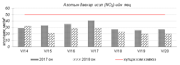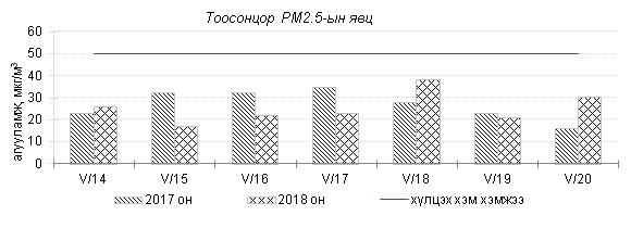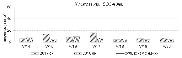 Өнгөрсөн 7 хоногийн агаарын чанарын хяналт шинжилгээний дүнгээр Улаанбаатар хотын агаарын чанар ихэнх өдрүүдэд “Бага” зэргийн бохирдолтой байлаа. Агаар дахь хамгийн их бохирдуулах бодис PM10 тоосонцор байсан ба 7 хоногийн дундаж агууламж 2017 оны мөн үетэй харьцуулахад 17%-иар их, 24 цагийн дундаж хамгийн их агууламж агаарын чанарын стандартаас 6.2 дахин их байна.