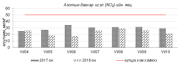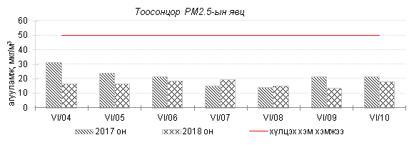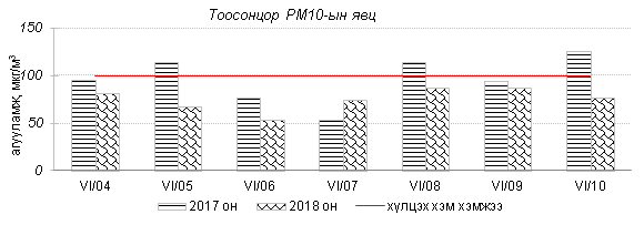 Өнгөрсөн 7 хоногийн агаарын чанарын хяналт шинжилгээний дүнгээр Улаанбаатар хотын төв автозам дагуу PM10 тоосонцор, азотын давхар ислийн бохирдол “Бага зэрэг” байсан бол бусад цэгт “Хэвийн” түвшинд байлаа. PM10 тоосонцрын 7 хоногийн дундаж агууламжийг өмнөх оны мөн үетэй харьцуулахад 22%-иар бага, азотын давхар ислийн агууламж 23%-иар бага, 24 цагийн дундаж хамгийн их агууламж агаарын чанарын стандартаас тус бүр 1.9 дахин их байлаа. Дэлгэрэнгүйг эндээс үзнэ үү.
